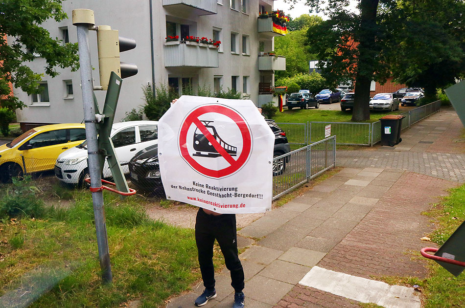 Aktivistinnen und Aktivisten der Gruppe: "Nein zur Reaktivierung der Bahnstrecke Bergedorf - Geesthacht!" begrüssten die Sonderzüge mit Neubautriebwagen Anlässlich dem 100-jährigen Stadtjubiläum von Geesthacht auf der Strecke Hamburg-Bergedorf - Geesthacht am 15. und 16. Juni 2024 mit Transparenten, Pappschildern und Protestzetteln im DIN A4-Format in Fenstern. Diese Gruppe von anwohnenden Menschinnen zwischen Hamburg-Bergedorf und Geesthacht hat sich in erster Linie in einer Facebook-Gruppe vereint, am 17. Juni 2024 hatte diese Gruppe stolze 290 Mitglieder. Alleine Geesthacht hat aber über 32.000 Einwohner, dazu kommen noch die Unterwegshalte zwischen Bergedorf und Geesthacht die auch mit der Bahn fahren müssten und in Zukunft auf das Auto oder den Bus, vielleicht so gar ohne Umstieg in Bergedorf in die S-Bahn verzichten müssten. Börnsen hat 4678 Einwohner und Escheburg 3991 Einwohner. Der Sinn und Zweck dieser Gruppe ist leicht erklärt: Sie wollen nicht das Planzüge an ihren Häusern, Gärten und Wohnungen vorbeifahren und sie möchten weiterhin mit dem Auto oder Bus fahren. Diese Gruppe hat auch eine Webseite. Auf der Webseite erklärt die Gruppe nicht nur das sie gegen die Reaktivierung der Bahnstrecke ist, nein sie machen auch Alternativvorschläge. Die Alternativen sind Elektro- und Wasserstoffbusse, Expressbusse, autonome Kleinfahrzeuge, Alternativ(umweg)routen (dann ist es vor eigenen Haustür noch etwas leiser). Entlang der Bahnstrecke soll ein Radschnellweg gebaut werden. Auf der Autobahn 25 soll eine Expressbusspur, wenn es nicht anders geht auf dem Standstreifen, eingerichtet werden damit die Expressbusse zum Doppelexpressbus werden können. Weiter hat man eine ganz innovative Idee. Die S21 (heute S2) soll von Aumühle oder Friedrichsruh nach Geesthacht, Lauenburg und Boizenburg über eine Neubaustrecke ohne unterwegs in oder an Ortschaften zu halten, also ohne Dassendorf und Hohenhorn anzubinden nach Geesthacht führen. aber dafür an den P+R-Parkplätzen Hohenhorn Süd und Grünhof Nord. Von Dassendorf und Hohenhorn könnte man dann aber mit dem Auto zum P+R-Bahnhof fahren. Ob diese Neubaustrecke andere Anwohnerproteste und Enteignungen nach sich ziehen würde, erläutert die Gruppe leider nicht. Das was sich hier wie Realsatire oder ein Wahlprogramm für Geesthacht der APPD (Anarchistische Pogo Partei Deutschlands - eine Spass-Partei) liest und scheint, wird von der Gruppe: "Für einen modernen und umweltfreundlichen ÖPNV mit Elektrobussen und Alternativrouten" und "für den Erhalt von Wohn- und Lebensqualität" aber ernsthaft vorgetragen. Auch wenn natürlich klar ist, dass solche Anwohnerproteste nicht nur einfach gegen die Bahn sein wollen weil sie sich ein Häuschen direkt an der Bahnstrecke gebaut oder gekauft haben sondern sie sich auch irgendwelche Gegenargumente aus den Fingern saugen mussten um nicht einfach nur egoistisch und knauserig (vermutlich war das Häuschen an der Bahn etwas günstiger wie in der ruhigen Sackgasse) zu wirken. In der Facebook-Gruppe finden sich übrigens auch anwohnende Personen die in ihrem Facebook-Profil die Deutsche Bahn AG als ihren Arbeitgeber eingetragen haben. Äusserst verärgert zeigte sich ein Aktivist in der Facebook-Gruppe darüber das einige ihrer Sonderzug-Reaktivierungs-Protest-Plakate vereinzeilt mit kleinen Aufklebern vom VCD (Verkehrsclub Deutschland) die die Reaktivierung der Bahnstrecke begrüssen überklebt wurden. Dies wollte man zur Anzeige bringen! Kritisiert werden übrigens die Anschaffungskosten für Loks bei einer Reaktivierung der Bahnstrecke nach Geesthacht. Weiter warnen die anwohnenden Aktivistinnen und Aktivisten vor Lärm, Abgasen und Erschütterungen, diese würden die Gesundheit der Anwohnenden gefährden. Offen bleibt aber die Frage warum die Aktivistinnen und Aktivisten der Gruppe: "Nein zur Reaktivierung der Bahnstrecke Bergedorf - Geesthacht!" nicht zum Geesthachter Bahnhof gekommen sind. Dort hätten sie hunderte Besucher, Lokalpolitiker, Geschäftsführer und Fahrgäste zu den Sonderzügen von den Vorzügen ihrer Alternativ-Vorschläge und den Vorzügen des eigenen Autos und dem Haus direkt an einer Bahnstrecke ohne Bahnverkehr überzeugen können. Jedenfalls haben die Aktivistinnen und Aktivisten der Gruppe: "Nein zur Reaktivierung der Bahnstrecke Bergedorf - Geesthacht!" für Unterhaltung in den Sonderzügen gesorgt. Während einige im Zug die einfach als: "bescheuert" (wenn man an die Bahn zieht muss man damit rechnen das da auch Züge fahren) diffamiert haben, hatten sich andere über diese amüsiert und gelacht und andere wiederum schrien immer amüsiert auf, da sind wieder Welche, oder da hängen auch Plakate, wie übrigens auch an einem Flüchtlingsheim. Digi Foto: IMG_7552.JPG Digi Fotos: 0369, FP10 Foto: Lars Brüggemann |