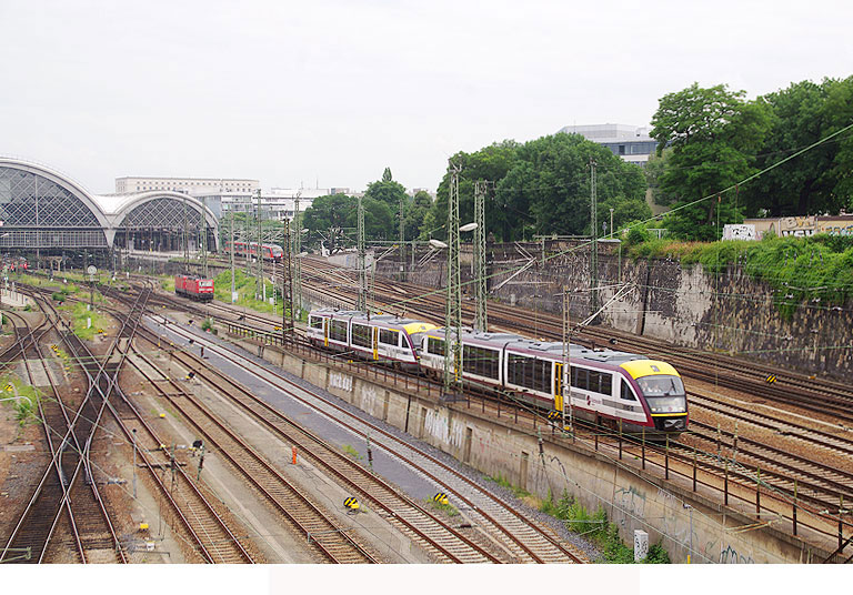 Drei ODEG Triebwagen vom Typ Regio-Shuttle vom Hersteller Stadler verlassen den Dresdner Hauptbahnhof, diese sind im Einsatz für Trilex die nicht ausreichend eigene Fahrzeuge für den Verkehr von Dresden nach Zittau und Görlitz haben. Links unten daneben zwei Desiros von Trilex. Dieses Foto finden Sie auch hier: Foto von Triebwagen der ODEG Digi Foto: IMGP2328.JPG Digi Fotos: 0256, Festplatte 3 (D28/D1/dobryiden15) Fotos: Lars Brüggemann |