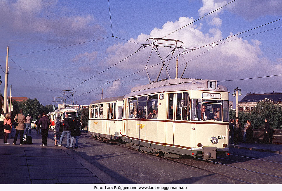 Der DVB- Museumswagen 1587 fährt am 29. September 2002 über die Augustusbrücke in Dresden in der Jubiläumsparade 130 Jahre Straßenbahn in Dresden. Bei dem Fahrzeug handelt es sich um einen Gotha Einheitstriebwagen ET 57 mit dem Baujahr 1959 oder 1960, die ehemalige Fahrzeugnummer ist 213 009-3. Dia U 19.454, FP1 BST: 1217 Foto: Lars Brüggemann Interner Vermerk: Dieses Foto ist noch unter einem anderen Dateinamen online (529ewd). |