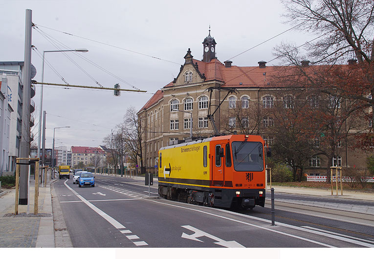 Der DVB-Arbeitswagen 201 001, ein Schienenschleifwagen, an der Haltestelle Pohlandplatz. Hierbei handelt es sich um einen Schienenschleifwagen der Firma Windhoff mit dem Baujahr 1997. In den Jahren 2003/2004 erfolgte ein Umbau an dem Fahrzeug. Digi Foto: IMGP4035.JPG Digi Fotos: 0242 (D1/D11/D2013) Foto: Lars Brüggemann |