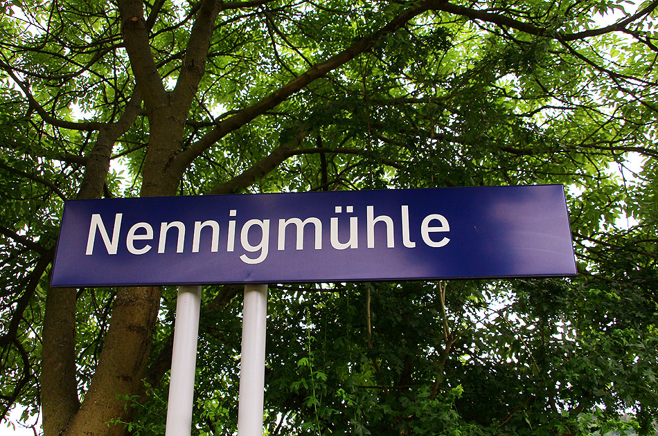 Ein Bahnhofsschild vom Bahnhof Nenningmühle. Der Haltepunkt Nennigmühle liegt an der Bahnstrecke Pockau-Lengefeld Olbernhau-Grünthal Neuhausen und wurde am 1. September 1877 nach der Streckeneröffnung eingerichtet. Gebaut wurde die Strecke von der Chemnitz-Komotauer Eisenbahngesellschaft die jedoch schon sehr schnell verstaatlicht wurde und so zu den Königlich Sächsischen Staatseisenbahnen überging. Digi Foto: IMG_6936.JPG Digi Fotos: 0297 (D19/D6/chemnitz18) Foto: Lars Brüggemann |
