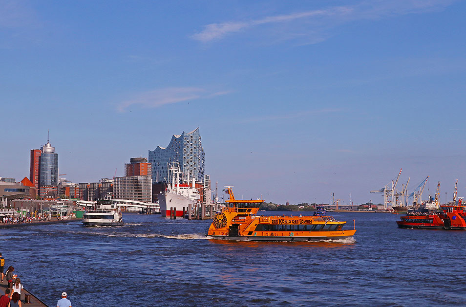Bei wem kommt hier Lust auf Urlaub in Hamburg auf? So eine schöne Aussicht hat man an den St. Pauli Landungsbrücken in Hamburg. In der Bildmitte die HADAG-Fähre Altenwerder III mit Werbung für das Musical: "Der König der Löwen". Oben links das Columbus Haus und oben in der Bildmitte die Elbphilharmonie und die Cap San San Diego. Die HADAG ist ein öffentliches Verkehrsmittel im HVV (Hamburger Verkehrsverbund) und wickelt den Fährverkehr im Hamburger Hafen und auf der Elbe in Hamburg ab. Die HADAG wurde 1888 als Reederei mit dem Namen: "Hafendampfschiffahrts-Actien-Gesellschaft" gegründet. Digi Foto: IMG_7812.JPG Digi Fotos: 0371, FP10 (D11/D8/+#24) Foto: Lars Brüggemann |