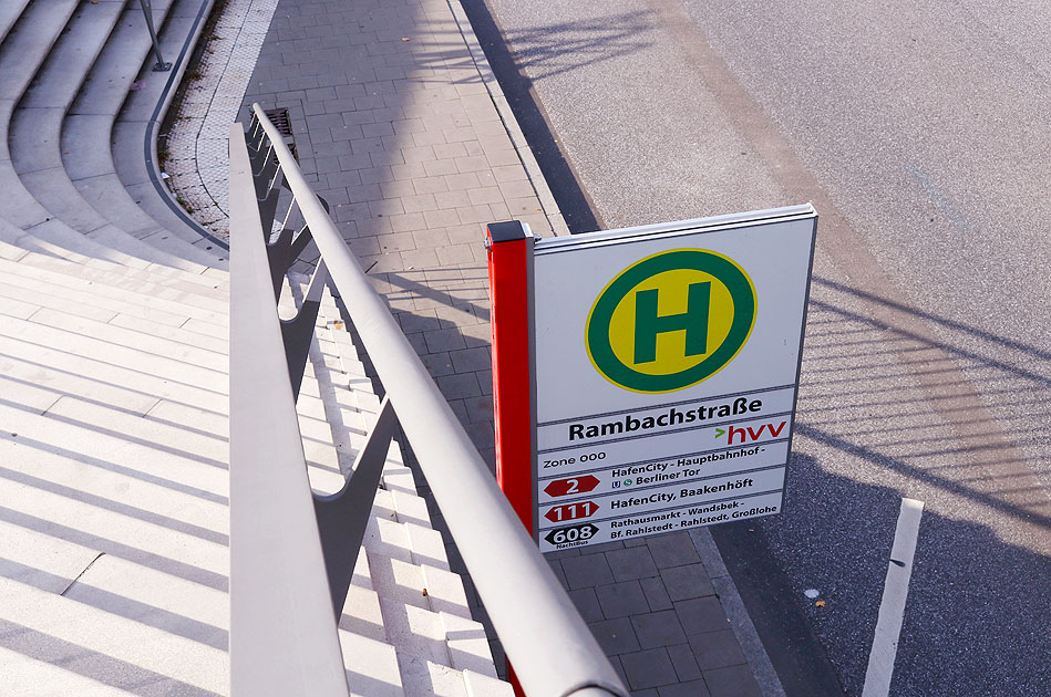 Ein Haltestellenschild der Bushaltestelle Rambachstraße in Fahrtrichtung Hafencity. Digi Foto: IMG_9592.JPG Digi Fotos: 0349 (D10/D10/#+22) Foto: Lars Brüggemann |