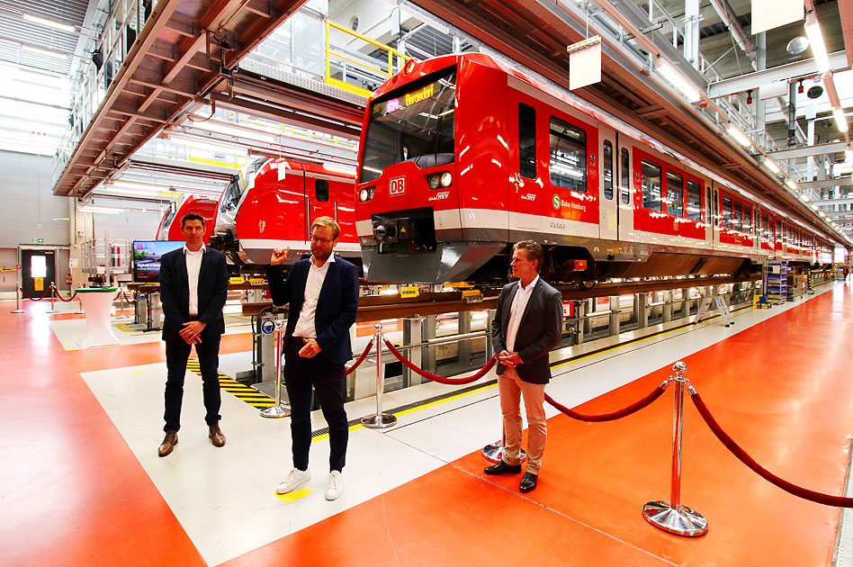 Am 27. August 2020 präsentierte die S-Bahn Hamburg GmbH ihre digitale S-Bahn (rechts im Bild). Links im Bild Jan Schröder der Projektleiter Digitale S-Bahn Hamburg, in der Bildmitte Dr. Anjes Tjarks Hamburgs Senator für Verkehr und Mobilitätswende und rechts Kay Uwe Arnecke der Geschäftsführer der S-Bahn Hamburg vor der ersten digitalen Hamburger S-Bahn, der 474 4046. Die S-Bahn Hamburg GmbH stellte ihre erste digital gesteuerte S-Bahn, also selbstfahrende - fahrerlose S-Bahn, vor, auch bekannt als unter Digitale Schiene oder Digitale S-Bahn Hamburg. Bereits vorher wurden auf der S-Bahn-Strecke für den digitalen Einsatz zwischen Hamburg Berliner Tor und Aumühle Testfahrten mit dem Trainguard ETCS-Zug 642 300 gemacht. Ziel ist es für den ITS-Kongress im Oktober 2021 in Hamburg vier Züge im Fahrgasteinsatz die digital fahrerlos zwischen Berliner Tor und Aumühle fahren sollen. Im Oktober 2021 möchte die S-Bahn Hamburg erstmals S-Bahnen mit Fahrgästen digital gesteuert einsetzen. Der erste Zug der Baureihe 474 ist nun technisch umgerüstet, die Einheit 474 4046. Kay Uwe Arnecke der Geschäftsführer S-Bahn Hamburg sagte: „Mit der digitalen Schiene haben wir eine intelligente Lösung für mindestens 20 Prozent mehr Kapazität, ohne einen Meter Gleis neu bauen zu müssen. Das bedeutet zusätzliche Züge, noch klimafreundlicheres Fahren und mehr Stabilität im Betrieb für unsere Fahrgäste. Das ist eine Premiere für die deutsche Bahnbranche und darüber hinaus.“ Jan Schröder der Projektleiter Digitale S-Bahn Hamburg ergänzte ihn: „Wir freuen uns sehr, heute das erste umgebaute Fahrzeug zeigen zu können. Das Projekt ist im Zeitplan. Der Umbau der weiteren drei Züge läuft bereits, die Teststrecke ist mit ETCS (European Train Control System) und ATO (Automatic Train Operation) ausgestattet. Gemeinsam mit Siemens entwickeln wir hier die Technik des bedeutendsten technologischen Wandels im Bahnbetrieb seit Jahren. Das ist eine Blaupause für die Gestaltung intelligenter und grüner Nahverkehrsnetze.“ Die „Digitale S-Bahn Hamburg“ wird auf dem Streckenabschnitt zwischen Berliner Tor und Bergedorf/Aumühle getestet. Basis für den hochautomatisierten Betrieb ist der künftige europäische Standard ATO über das funkbasierte europäische Zugsicherungssystem ETCS. Die Projektkosten von rund 60 Millionen Euro teilen sich die Stadt Hamburg, Deutsche Bahn und Siemens. Die umgebauten Züge lassen sich kaum von den herkömmlichen Zügen unterscheiden. Unter den Fahrzeugspitzen haben Sie ein gelbes Kästchen für den Funk, unter dem Mittelwagen einen Kasten für Technik und die Türen sind selbstschliessend und Türschliesswarnton versehen. Der ITS-Kongress als grosses Aushängeschild für Hamburg wurde natürlich schon lange im voraus von der Stadt Hamburg dauernd kommuniziert und als Werbung genutzt für das was Hamburg für den Kongress geschaffen hat bzw. wie innovativ der Verkehr in Hamburg doch sei. Von dem Kongress selbst darf auch nicht jeder Journalist berichten, Journalisten die davon berichten möchten müssen sich nicht nur wie üblich davor und dafür akkredetieren sondern sie müssen auch einen Scan von ihrem Presseausweis dem Veranstalter auf deren Webseite hochladen. Wer das nicht macht oder gar keinen Presseausweis hat, der soll von dem ITS-Kongress auch nicht berichten. Aber was will man von einer Stadt ohne Straßenbahn auch schon erwarten? Die Bürgerinitative Prellbock Altona wusste auch diesen Kongress zu kritisieren: "Mit großem Aufwand und viel internationaler Prominenz aus Konzernen, internationalen Verbänden sowie der EU- und Ministerialbürokratie wird vom 11. bis 15. Oktober 2021 in Hamburg der ITS-Weltkongress in Szene gesetzt. Er dreht sich im Wesentlichen um Autonomes Fahren und Smart Cities. Die bekannten High-Tech-Konzerne aus dem Silicon Valley, die dort, wo sie in Europa Geschäfte machen, keine Steuern zahlen, werden beim ITS-Weltkongress zu Hochform auflaufen." In der Liste der hochkarätigen Redner auf dem ITS-Kongress stehen Personen wie Dr. Richard Lutz, Vorstandsvorsitzender bei der Deutschen Bahn AG, Dr. Anjes Tjarks Hamburgs Verkehrssenator, Daniel Deparis von der Mercedes Benz AG, Christian Kaiser und Aria Etemad von der Volkswagen AG, Michael Hofmann von Audi, Randell Iwasaki von Amazon oder Roland Werner von Uber. Weiter der Prellbock Altona: "Was den Bürgerinnen und Bürgern als Zukunft verkauft werden soll, trägt nicht dazu bei, die Städte lebenswerter und für den Klimawandel fit zu machen... Schon heute leiden wir unter den Auswirkungen der „modernen“ Mobilität, indem wir nachts über wild herumliegende E-Roller stolpern und autonom fahrende Minibusse und Moias die Straßen zusätzlich verstopfen. Wer soll den ganzen Digitalisierungswahn bezahlen? Voraussichtlich am Ende die Steuerzahlenden und ÖPNV-Nutzenden. Allein die Digitalisierung der S-Bahn kostet 800 Mio. Euro! Damit ist noch kein Kilometerneuer S-Bahnstrecke gebaut..." Weiter resümiert der Prellbock Altona: "Die ganz banalen Dinge, die die Bürgerinnen und Bürger interessieren, werden auf dem Kongress nicht behandelt. Das sind so ganz einfache Fragen wie: Fahren die Züge und Busse pünktlich? Fahrerlose Züge und Busse sind nicht zwingend pünktlicher. Und digitalisierte Systeme sind auch störanfällig. Bei Ausfall des Zentralcomputers steht dann gleich das ganze System still! Gibt es bezahlbare ÖPNV-Tickets (z.B. für 365 Euro / Jahr wie in Wien)? Wann gibt es ein einheitliches ÖPNV-Ticket für alle deutschen Städte, sodass man sich nicht in jeder Stadt mit anderen Tarifsystemen und Ticketautomaten abquälen muss? Wie kann der Verkehrsraum in der Stadt so verteilt werden, dass Radfahrende und Fußgänger Platz entsprechend ihrem Verkehrsanteil bekommen, das wären zum Beispiel in Hamburg zirka 50 Prozent der gesamten Straßenfläche? Wie kann der Verkehrslärm reduziert werden? Wie kann die Barrierefreiheit der öffentlichen Verkehrsmittel verbessert 