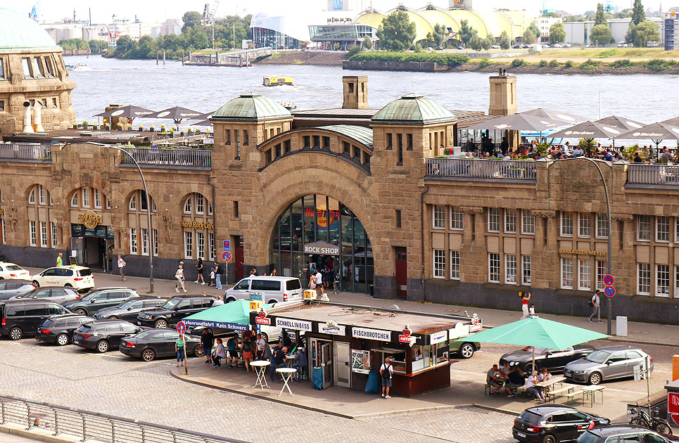 Das Abfertigungsgebäude der St. Pauli Landungsbrücken in Blickrichtung Osten. Links oben etwas vom Baum verdeckt, der Pegelturm. Rechts unten steht der Schnellimbiss Am Alten Elbtunnel mit der Anschrift Bei den St. Pauli Landungsbrücken 5. Oben links die Elbphilharmonie. Digi Foto: IMG_3742.JPG Digi Fotos: 0370, FP10 (D19/D7/#+24) Foto: Lars Brüggemann |