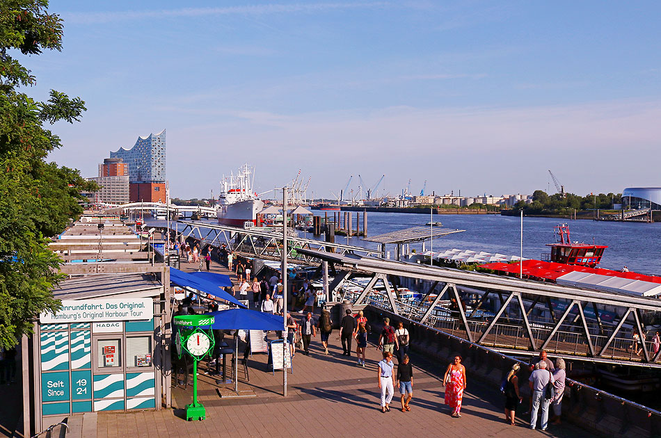 Viele denken hier gleich an Urlaub in Hamburg: Die Landungsbrücken in Hamburg, in der Mitte oben die Elbphilharmonie. Hier kann man gemütlich entlang laufen oder über eine der Brücken zum Anleger runter gehen. Ganz rechts im Bild das Museumsschiff Rickmer Rickmers der Frachtensegler von 1896 und die Cap San Diego das größte betriebsfähige Museumsschiff weltweit. Digi Foto: IMG_5456.JPG Digi Fotos: 0346, FP8 (D20/D7/+#22) Foto: Lars Brüggemann |