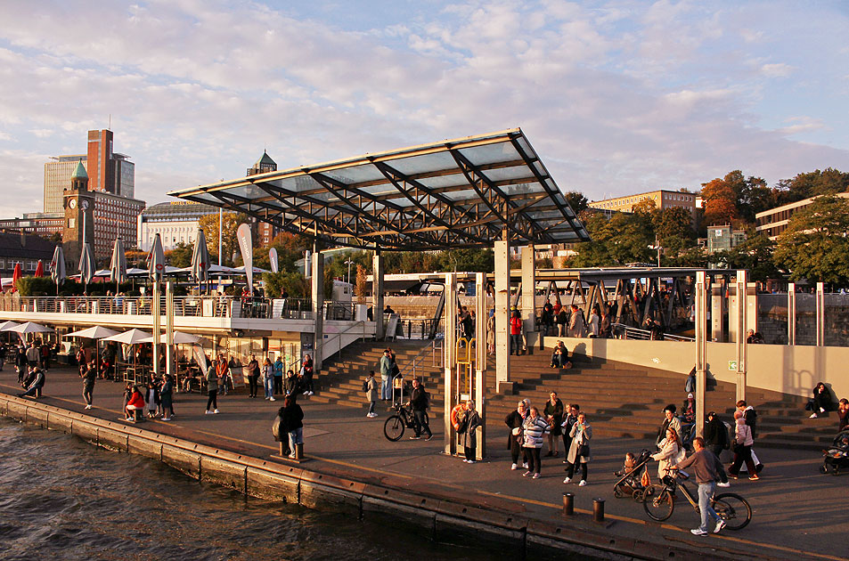 Herbst an den St. Pauli Landungsbrücken: An der Brücke 1 beginnen die Landungsbrücken, von hier aus kann man bis zur Brücke 10 laufen. Unter Brücke 10 verstehen viele aber auch die Brücke 10 bei der es Fischbrötchen gibt. Denn bei der Brücke 10 gibt es Fischbrötchen, Bier und andere Getränke. Viele Hamburg Urlauber kennen die Brücke 10 und schwören darauf. Oben rechts die Jugendherberge auf dem Stintfang. Digi Foto: IMG_5579.JPG Digi Fotos: 0373, FP10 (D18/D10/+#24) Foto: Lars Brüggemann |