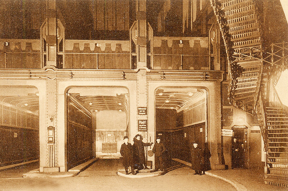 Auf dieser historischen Ansichtskarte sieht man den Elbtunnel in Hamburg in der Zeit nach seiner Eröffnung. Stolz hat sich das Aufzugspersonal für den Fotografen aufgestellt. Der Alte Elbtunnel heißt eigentlich St. Pauli Elbtunnel, denn er führt von St. Pauli nach Steinwerder, unter der Elbe. Wenn man als Hamburg-Besucher an den Landungsbrücken ist, muss man auch den Elbtunel gesehen haben. Und man sollte unbedingt in Steinwerder wieder nach oben gehen oder fahren und dort die Aussicht vom Bornsteinplatz genießen. Der Alte Elbtunnel wurde am 7. September 1911 eröffnet. Wahlweise kann man die Treppe, den Personenaufzug oder den Lastenaufzug nehmen um runter- oder hochzufahren. Hier läuft man unter der Elbe ohne dabei nass zu werden. Und man sollte nicht nur durch den Elbtunnel laufen, an den Wänden sind Keramikplatten, Reliefs mit Tiermotiven. Foto: elbtunnel-002 FP15 Foto: Sammlung Lars Brüggemann Interner Vermerk: Dieses Foto ist noch unter einem anderen Dateinamen online. |