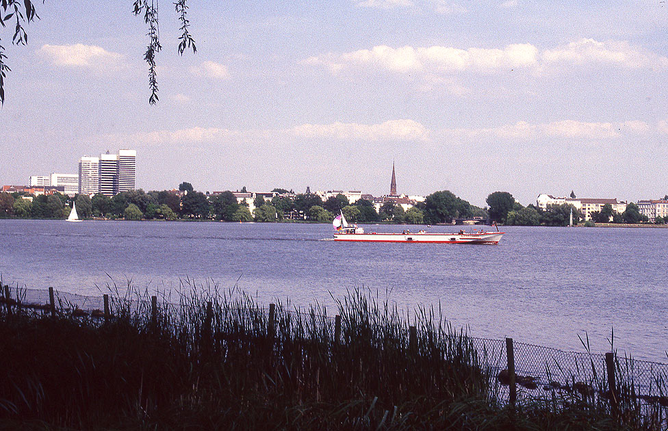 Der Alsterdampfer Alster Cabrio in der Bildmitte auf der Hamburger Außenalster. Die bequemste Form die Außenalster zu sehen eine Fahrt mit dem Alsterdampfer. Links oben im Bild die drei Mundsburg Tower. An der Außenalster kann man wunderbar spazieren gehen oder einmal um die ganze Außenalster laufen. Dia U 29.075 FP10 (D5/#+00) Foto: Lars Brüggemann |