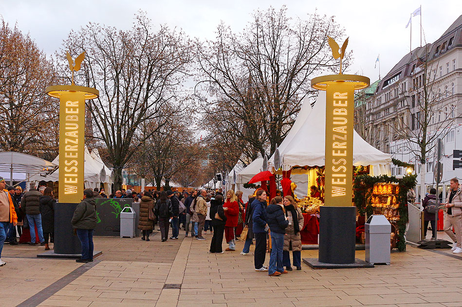 Wer noch auf der Suche nach Weihnachtsgeschenken ist, der oder die könnte hier fündig werden. Auf dem Hamburger Jungfernstieg ist ein ganz besonderer Weihnachtsmarkt. Der Weihnachtsmarkt Weißer Zauber ist selbsterklärend warum die Weihnachtsmarkt-Zelt-Stände alle weiß sind. Noch bis zum 23. Dezember 2025 geht der der Weihnachtsmarkt Weißer Zauber auf dem Jungfernstieg. Und gleich nebenan am Schiffsanleger von den Landungsbrücken liegen die Märchenschiffe die in Wirklichkeit Alsterdampfer sind. Hier auf dem Weihnachtsmarkt Weißer Zauber gibt es Poffertjes, Kerzen, Holzschmuck, Schafskäse, eine Feuerzangbowle, Schaltücher aus Kashmir, ein Mini Weihnachtsdorf, Glühwein, Holzspiele, Olivenholz, Silberschmuck, Fleischspieße, Mandeln und Nüsse, Crepes, Bratwurst, Maronen, Lichterketten, Maiskolben, lachende Tassen, Leberkäse, Waffeln, Kaffee, Schmalzkuchen, Fisch, Gewürze, Backformen, ein historisches Riesenrad und vieles mehr! Digi Foto: IMG_2078.JPG - interner Vermerk ###Monat 12 - Tag 9### Digi Fotos: 0386, FP10 (D29/D11/+#25) Foto: Lars Brüggemann |