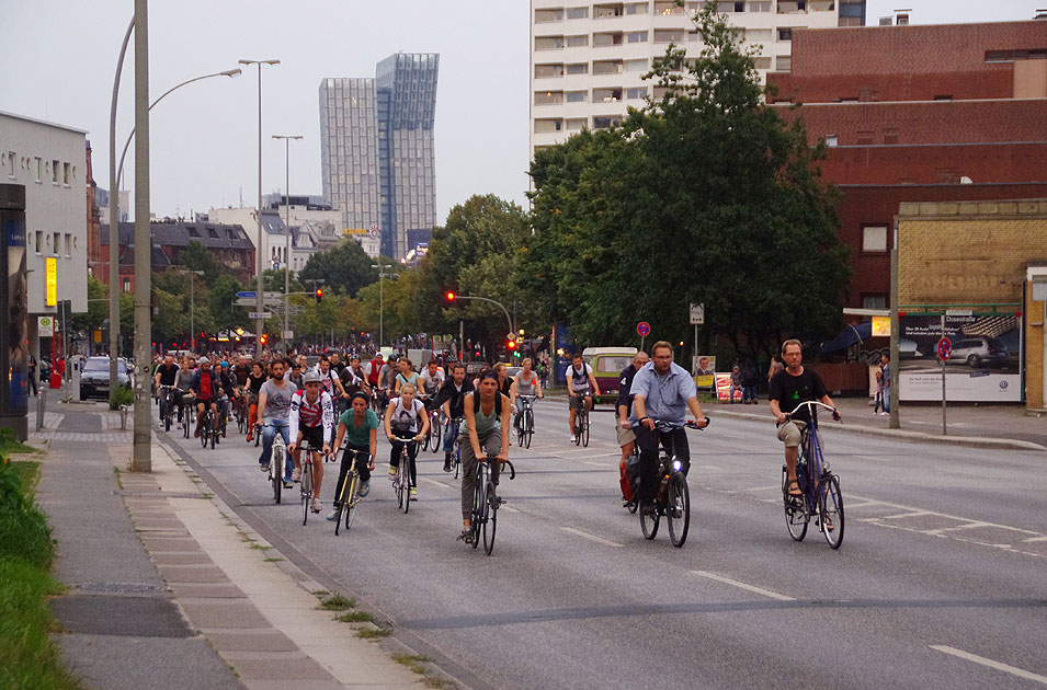 Einmal im Monat, jeden letzten Freitag im Monat, findet in Hamburg die Critical Mass Fahrradfahrt statt. Hier fahren tausende Fahrradfahrer quer durch die Stadt über abwechselnde Routen. Auch die Startpunkte der Fahrradfahrten wechseln, die werden immer auf der Webseite von Critical Mass bekanntgegeben. Während manche Autofahrer über diese Fahrradfahrt verärgert sind, haben die Radfahrer an der Fahrt viel Spaß. Hier braucht man keine Startnummer, kein Rennrad, hier darf jedes Fahrrad mit. Digi Foto: IMGP6342.JPG Digi Fotos: 0239, FP3 (D30/D8/+#13) Foto: Lars Brüggemann |