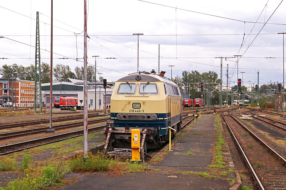 Die 218 446-3 ruht sich hier auf einem Abstellgleis in Hof Hbf aus und wartet geduldig auf ihren nächsten Einsatz. Links im Hintergrund das Bw (Bahnbetriebswerk) Hof. Hof ist eine Stadt in Nordosten von Bayern und eigentlich in Franken an der Saale. Von 1949 bis 1990 war Hof ein Grenzbahnhof von der BRD (Bundesrepublik Deutschland) zur DDR (Deutsche Demokratische Republik). Digi Foto: IMG_6075.JPG Digi Fotos: 0372, FP10 (D25/#9/#24) Foto: Lars Brüggemann Interner Vermerk: Dieses Foto ist noch unter einem anderen Dateinamen online. |