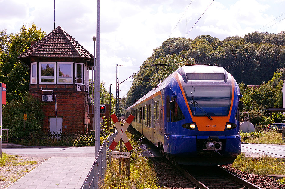 Der Cantus-Flirt 427 504 fährt in den Bahnhof Friedland auf der Fahrt nach Göttingen ein. Links im Bild das Stellwerk Ff. Digi Foto: IMGP2446.JPG Digi Fotos: 0174 (D21/D8/#+08) Foto: Lars Brüggemann Interner Vermerk: Dieses Foto ist noch unter einem anderen Dateinamen online. |