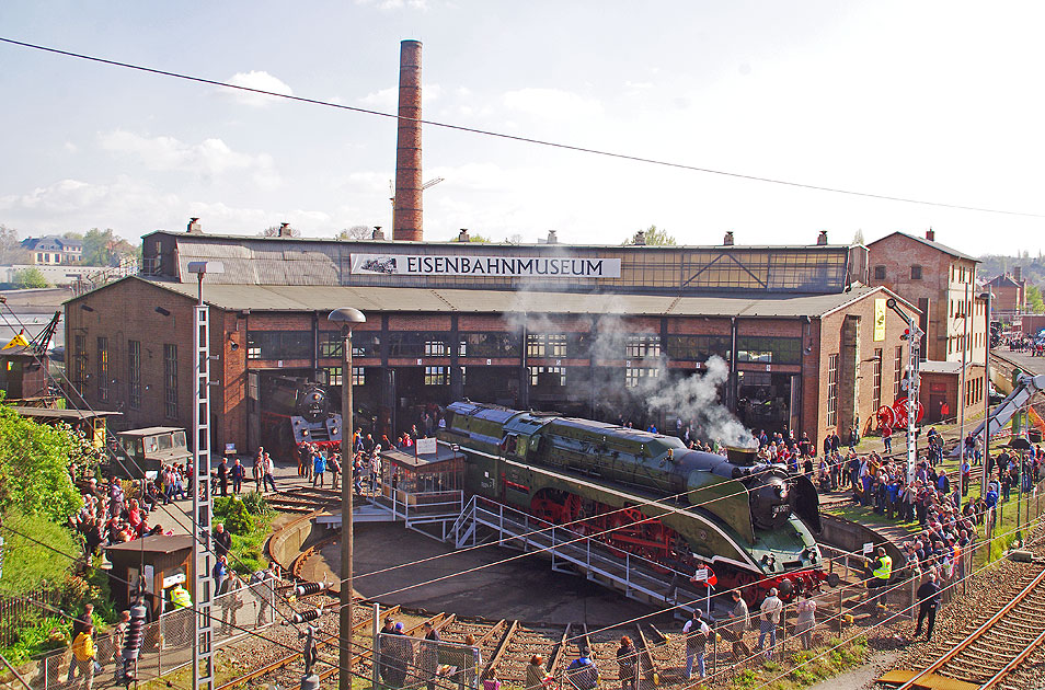 Die Dampflok 18 201 beim Dresdner Dampfloktreffen im Bw Dresden-Altstadt auf der Drehscheibe vor dem Ringlokschuppen. Die 18 201 war ursprünglich die 61 002 und bespannte den Henschel-Wegmann-Zug und verblieb nach dem Zweiten Weltkrieg in der Ostzone in Dresden. Um das Jahr 1952 hatte die Dampflok 61 002 auf ihrer Verkleidung die Losung getragen: "Die Heimat lieben, die Atombombe ächten, den Frieden erzwingen". Da die Lok ein Einzelstück in der DDR war, war mit ihr in der Ostzone nicht so viel anzufangen. war ihre Wartung recht aufwendig Für die DDR-Reichsbahn wurde die Lok 61 002 als Versuchsmaschine für hohe Geschwindigkeiten interessant. Sie wurde umgebaut und mit einem Schlepptender zur 18 201 und später ab 1970 zur 02 201-0. Die 61 001 verblieb nach dem Zweiten Weltkrieg im Westen, erlitt in Münster 1951 einen Unfall, wurde 1952 ausgemustert und 1957 verschrottet. Digi Foto: IMGP2855.JPG Digi Fotos: 0247 (D11/D4/D2014) Foto: Lars Brüggemann |