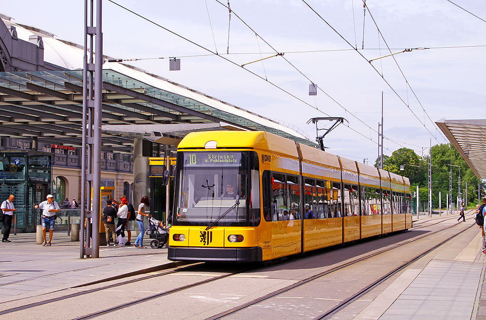 Mit Elektromobilität durch Dresden: Der Dresdner Straßenbahnwagen DVB 2713 als Linie 10 nach Striesen über Pohlandplatz an einem warmen Sommertag an der Haltestelle Hauptbahnhof. Digi Foto: IMG_3018.JPG Digi Fotos: 0286, FP8 (D24/D7/#+17) Foto: Lars Brüggemann |