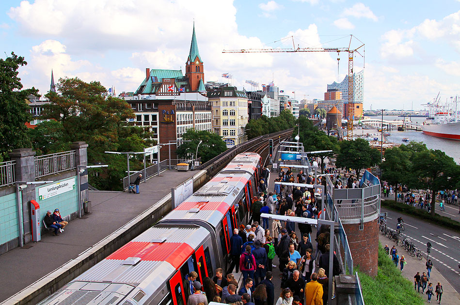 Die wohl schönste Form der Anreise zu den Landungsbrücken in Hamburg führt wohl mit der U-Bahn vom Hauptbahnhof. Hier fahren zwei DT5 der Hamburger Hochbahn als Linie U3 vom Baumwall kommend in die Haltestelle Landungsbrücken ein. Oben links die schwedische Seemannskirche, oben rechts die Elbphilharmonie. Mittig rechts das Alex und mittig ganz rechts die Überseebrücke. Und unten rechts die bekannte Jan-Fedder-Promenade. Digi Foto: IMG_3680.JPG Digi Fotos: 0379, FP10 (D26/D4/+#25) Foto: Lars Brüggemann |