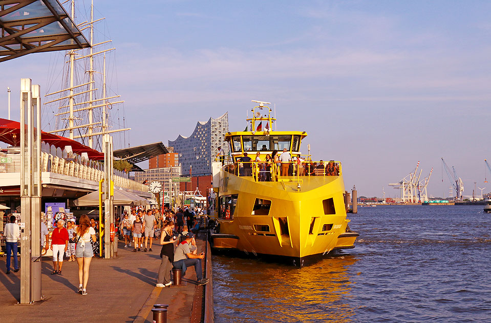Abends im Sommer auf dem Anleger an den Landungsbrücken in Hamburg. In der Bildmitte die HADAG-Fähre Grasbrook als Musical-Shuttle. Der Musical-Shuttle bringt Musical-Besucher von den Landungsbrücken zum Musical am anderen Ufer und zurück. Die Elbphilharmonie ragt oben noch in der Mitte hevor. Und auf dem Anleger selbst ist ordentlich was los. Digi Foto: IMG_8869.JPG Digi Fotos: 0383, FP10 (D16/D8/#+25) Foto: Lars Brüggemann |