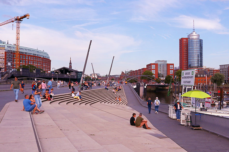 Wer bekommt hier Lust auf Hamburg, Elbe, Urlaub, Hafenrundfahrt, Bier und Fischbrötchen? Dies hier ist der Blick über die Jan-Fedder-Promenade in Richtung Baumwall. Oben in der Bildmitte das Columbus Haus, in der Mitte das Alex, oben rechts die Elbphilharmonie und ganz rechts die Überseebrücke. Die Jan-Fedder-Promenade ist beliebt bei Hamburgern und Hamburg-Besuchern. Digi Foto: IMG_6925.JPG Digi Fotos 0372, FP10 (D3/D9/#+24) Foto: Lars Brüggemann |