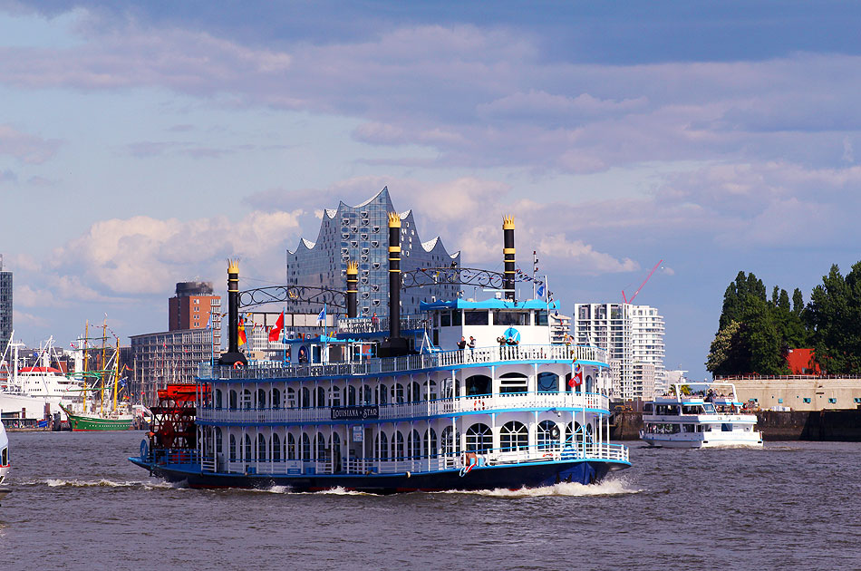 Die MS Louisiana Star von Rainer Abicht vor der Elbphilharmonie auf der Elbe in Hamburg. Die MS Louisiana Star von Rainer Abicht, ein Schaufelradschiff. Die MS Louisiana Star wurde 1999 gebaut und ist für 500 Personen zugelassen. Digi Foto: IMG_4606.JPG Digi Fotos: 0373, FP10 (D23/D8/+#24) Foto: Lars Brüggemann |
