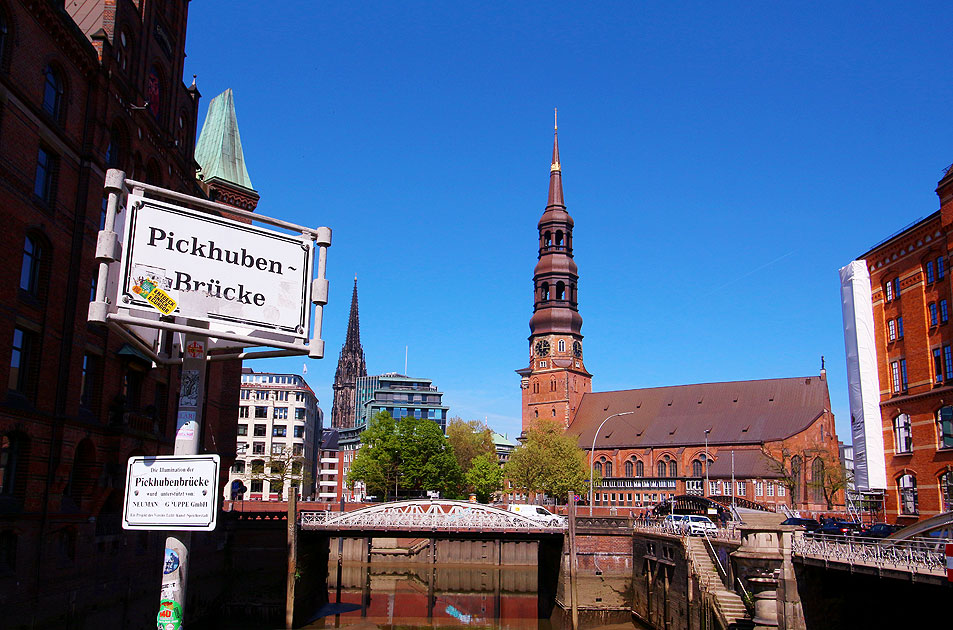 Die Hamburger Hauptkirche St. Katharinen sieht man bereits aus der Speicherstadt. Im Vordergrund noch das Schild der Pickhubenbrücke der Straße Pickhuben über das Kleine Fleet. Wie man sieht, von der Pickhubenbrücke hat man eine schöne Aussicht und sie bietet sich für Touristen an schöne Erinnerungsfotos zu machen. Die Katharinenkirche ist eine besondere Sehenswürdigkeit in Hamburg. Dienstags von 10 bis 14 Uhr findet auf dem Katharinenkirchhof ein Wochenmarkt statt.