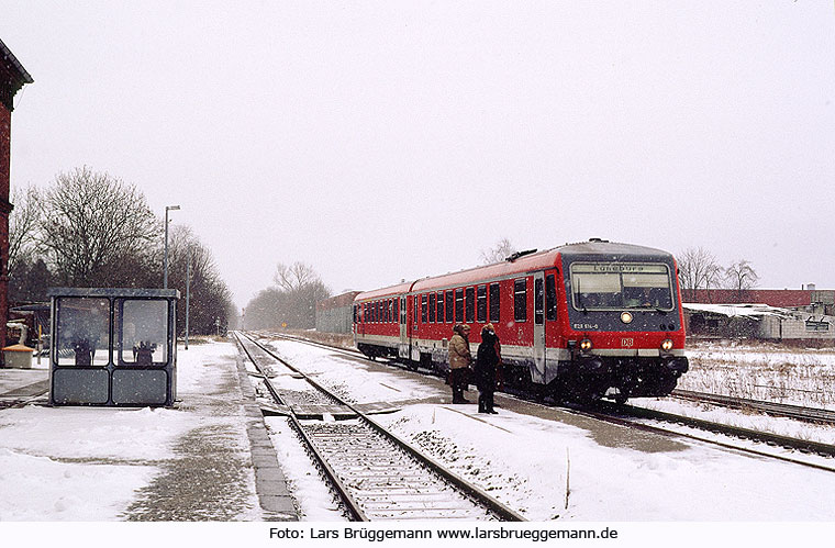 Am 28. Februar 2005 fährt der 628 614-0 auf der Fahrt von Dannenberg Ost nach Lüneburg West in den Bahnhof Dahlenburg ein. Dia 8753-2 Foto CD Zusammenfassung, Festplatte 1 Foto: Lars Brüggemann www.larsbrueggemann.de |