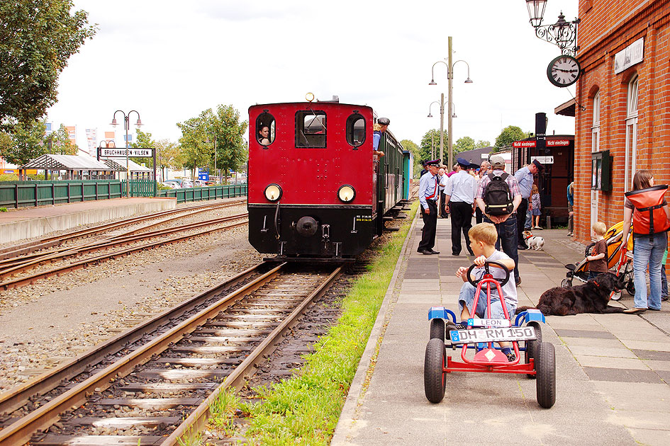 Der Bahnhof Bruchhausen-Vilsen, vor dem Bahnhofsgebäude der Wismarer Schienenbus T 41 mit dem Namen: "Maus" eines der beliebtesten Schmuckstücke der Museumsbahn. Häufig wollen in dem Schienenbus mehr Fahrgäste mitfahren als er über Plätze verfügt. Filmtipp: Schauen Sie sich mal bei Youtube die DEV Wochenschau auf dem Kanal wollywoodfilm an, dort gibt es wunderbare Filme von und über die Museumsbahn, auch als Spielfilme zu sehen. Ganz in der Nähe vom Bahnhof Bruchhausen-Vilsen, einfach immer entlang der Gleise nach Asendorf befindet sich das Gartenbahncafe Volldampf. Hier werden Getränke mit der Lehmann-Gartenbahn serviert! Digi Foto: IMGP2308.JPG Digi Fotos: 0215 (D6/D8/+#11) Foto: Lars Brüggemann Interner Vermerk: Dieses Foto ist noch unter einem anderen Dateinamen online. |