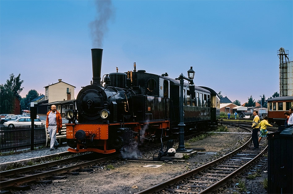 Entschleunigt reisen: Der DEV T 44 von der Inselbahn Juist im Bahnhof Bruchhausen-Vilsen. Links im Bild die noch im Bau befindliche Drehscheibe. Rechts am Bildrand ein Normalspur-Museumszug. Dieser Triebwagen wurde 1950 von Talbot gebaut und an die Euskirchener Kreisbahnen geliefert. Schon 1959 ging der Triebwagen dann die Inselbahn Juist wo er bis 1982 im Einsatz war. 1982 gelangte der Triebwagen als Geschenk an den DEV. Hinter dem T 44 der Wagen 2, ebenfalls von Talbot. Dieser wurde 1948 von Talbot an die Geilenkirchener Kreisbahn geliefert und gelangte von dort an die Kleinbahn Hoya-Syke-Asendorf, dann weiter an die Inselbahn Spiekeroog und darauf an die Deutsche Bundesbahn für die Inselbahn auf Wangerooge. 1992 kam der Wagen dann zum DEV. Farblich ist der Wagen auch den Triebwagen angepasst. Am Zugschluss der Packwagen 56, dieser wurde von 1899 von der Waggon-Fabrik AG Uerdingen an die Kleinbahn Hoya-Syke-Asendorf geliefert. Zunächst war der Wagen ein normaler Güterwagen. Mit der Einführung des Triebwagenverkehrs wurde er zum Packwagen umgebaut. So trägt der Wagen 56 auch die creme-rote Triebwagen-Farbgebung. Dia U 11.537-1 (D5/D8/+#06) Foto CD Zusammenfassung Foto: Lars Brüggemann Interner Vermerk: Dieses Foto ist noch unter einem anderen Dateinamen online. |