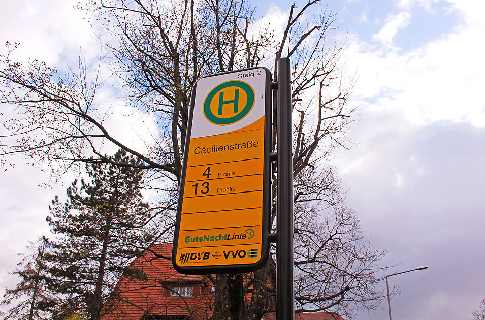 Mit Elektromobilität durch Dresden: Ein Haltestellenschild der Straßenbahn-Haltestelle Cäcilienstraße in Dresden. Hier auf dem Foto fahren von hier die Linien 4 und 13 nach Prohlis. Digi Foto: IMG_5456.JPG Digi Fotos: 0390, FP 14 (D31/D3/#+26) Foto: Lars Brüggemann |