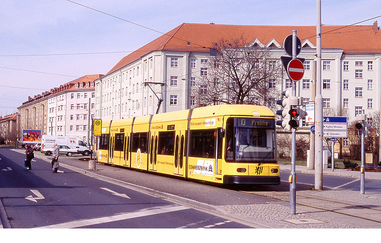 Mit Elektromobilität durch Dresden: Der DVB 2513 steht in der Kehre Dresden-Mickten, aufgenommen am 20. März 2003. Die Straßenbahn fährt wieder als Linie 13 nach Prohlis zurück. Dia U 24.160 Festplatte 2 Foto: Lars Brüggemann |