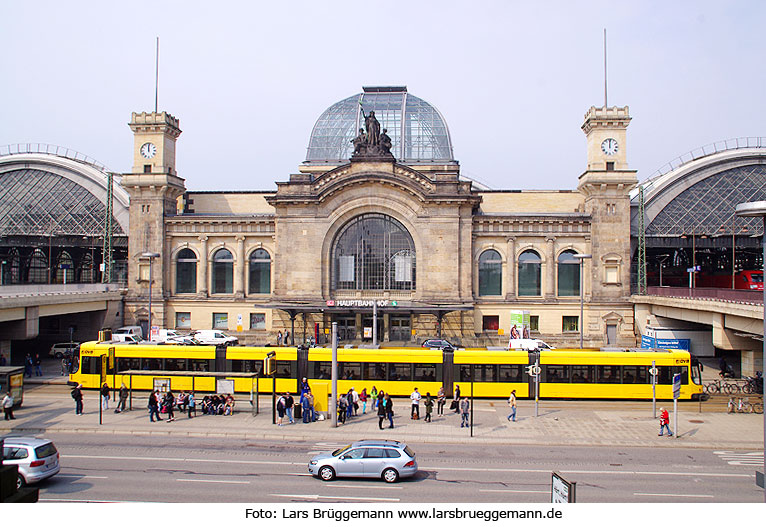 Mit Elektromobilität durch Dresden: Der Dresdner Straßenbahnwagen DVB 2843, ein NGTD12DD, vor dem Haupteingang des Dresdner Hauptbahnhof. Digi Foto: IMGP9157.JPG Digi Fotos: 0235 (D22/D4/#+13) Foto: Lars Brüggemann |