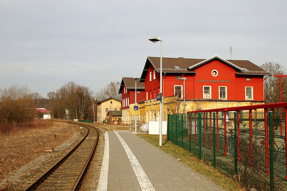 Der Bahnhof Großröhrsdorf in Sachsen an der 1871 in Betrieb genommenen Bahnstrecke von (Pirna) - Radeberg nach Kamenz - (Lübbenau). Die Bahnstrecke war zweigleisig geplant, doch die Strecke war nur zwischen Arnsdorf - Dürröhrsdorf und Pirna zweigleisig, der Rest der Strecke eingleisig allerdings wurde ein Planum für ein zweites Gleis geschaffen was man noch heute an der Strecke sehen kann, auch an Brücken über die Strecke unter denen ein zweites Gleis gelegt werden könnte. Am Bahnhof Großröhrsdorf gab es einen Gleisanschluss zur 1887 eröffneten Brauerei: Böhmisch Brauhaus Großröhrsdorf. Dieser einstmals große Bahnhof mit seinen Gleisen, dem Bahnhofsgebäude mit Nebengebäuden, dem Gleisanschluss zur Brauerei, dem Güterschuppen und dem Bahnhofsvorplatz hat seine große Bedeutung verloren. Großröhrsdorf ist heute ein einfacher Haltepunkt mit kameraüberwachtem Parkplatz. Zugkreuzungen sind hier nicht mehr möglich. Digi Foto: IMG_4076.JPG Digi Fotos: 0330 (D3/D3/antje21) Foto: Lars Brüggemann Diese Seite ist ein Teil einer Online-Foto-Sammlung ähnlich einem Bildband, Sie können sich hier von Bahnhof zu Bahnhof durchklicken. Vielleicht suchen Sie aber Fotos für eine Heimatchronik, ein Fachbuch oder einen Fachartikel? Schreiben Sie mir! Email an Lars Brüggemann: mail@larsbrueggemann.de Hierbei handelt es sich um ein journalistisches Angebot, es richtet sich nicht an bildersammelnde Eisenbahnfreunde zur kostenlosen Zusendung (für "private Zwecke"). Ebenso bitte ich um Verständnis das ich als Journalist keine kostenlosen Fotos für Veröffentlichungen anbiete (selbst bei so verheißungsvollen Angeboten wie: "selbstverständlich schreiben wir auch Ihren Namen dazu"). zurück zur: Startseite |