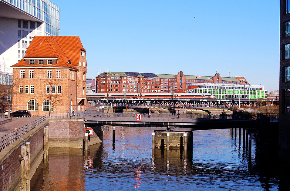 Hamburg, die Bahn und seine Brücken: Den Hamburger Hauptbahnhof hat soeben ein ICE verlassen und fährt hier über die Oberhafenbrücke. Der ICE ist unterwegs in Richtung Süden, nicht nur nach Harburg, weiter südlich. Wer mit dem Zug nach Hamburg fährt oder Hamburg verlässt und hier lang fährt, der sollte unbedingt den Ausblick genießen oder sein Handy bereit halten. Unten im Vordergrund der Brooktorhafen, in der Bildmitte die Ericusbrücke und auf der Oberhafenbrücke der ICE. Hinter der Ericusbrücke heißt das Gewässer dann auch Ericusgraben. Das historische Gebäude links im Bild ist das Alte Zollhaus. Das Alte Zollhaus in der Hafencity wurde 1911 gebaut und steht heute unter Denkmalschutz. Die Postanschrift von dem Alten Zollhaus ist Rudolf-Augstein-Promenade 1. Digi Foto: IMG_1242.JPG Digi Fotos: 0378 (D19/D3/#+25) Foto: Lars Brüggemann |