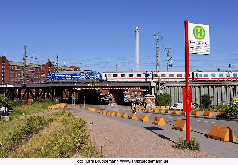 An der Bushaltestelle Oberhafenbrücke in der Stockmeyerstraße fährt am 20. Juli 2016 eine Werbelok der Baureihe 101 vorbei. Diese Haltestelle wird nur nachts von der Nachtbuslinie 602 von Tiefstack über die Hafencity zum Osdorfer Born bedient. Unter der Lok im Hintergrund steht die bekannte Oberhafenkantine. Digi Foto: _MG_0469.JPG Digi Fotos: 0274 Foto: Lars Brüggemann |