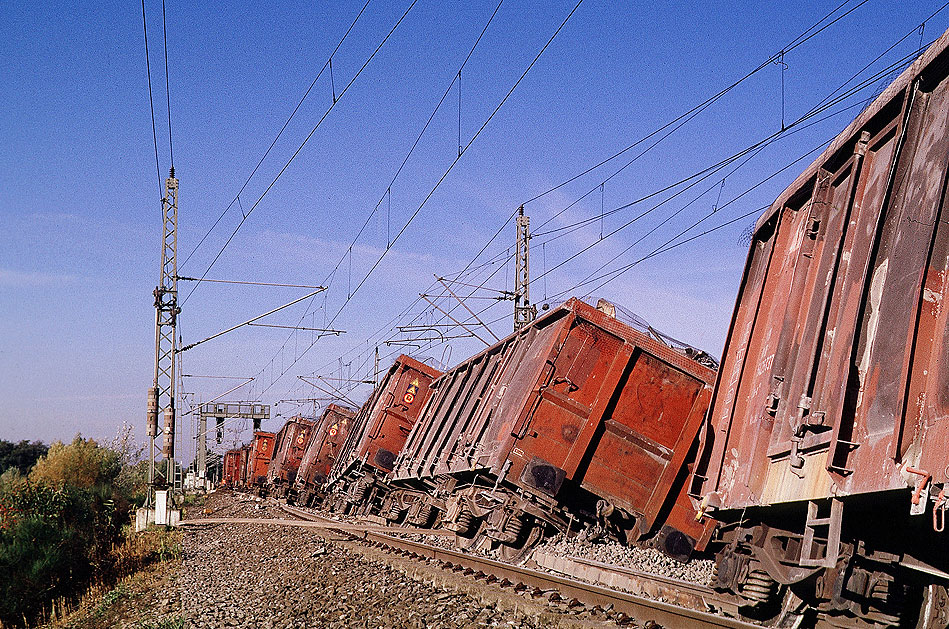 Menschen kamen bei diesem schweren Zugunglück zum Glück nicht zu Schaden. Am morgen des 22. Oktober 2003 stehen hier nach der Entgleisung von diesem Güterzug im Schotter. Dia 7304-4 Foto CD 066a, Foto CD Zusammenfassung Foto: Lars Brüggemann Weitere Fotos von dem Zugunglück Interner Vermerk: Dieses Foto ist noch unter einem anderen Dateinamen online. |