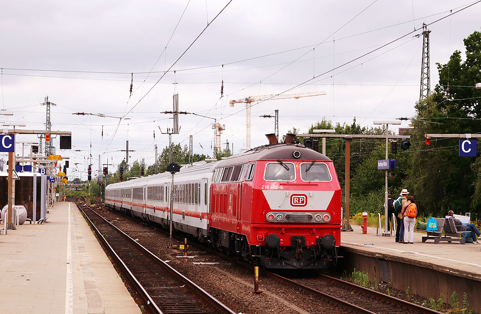 Eine Press 218 mit einem IC von Hamburg-Altona nach Westerland auf Sylt