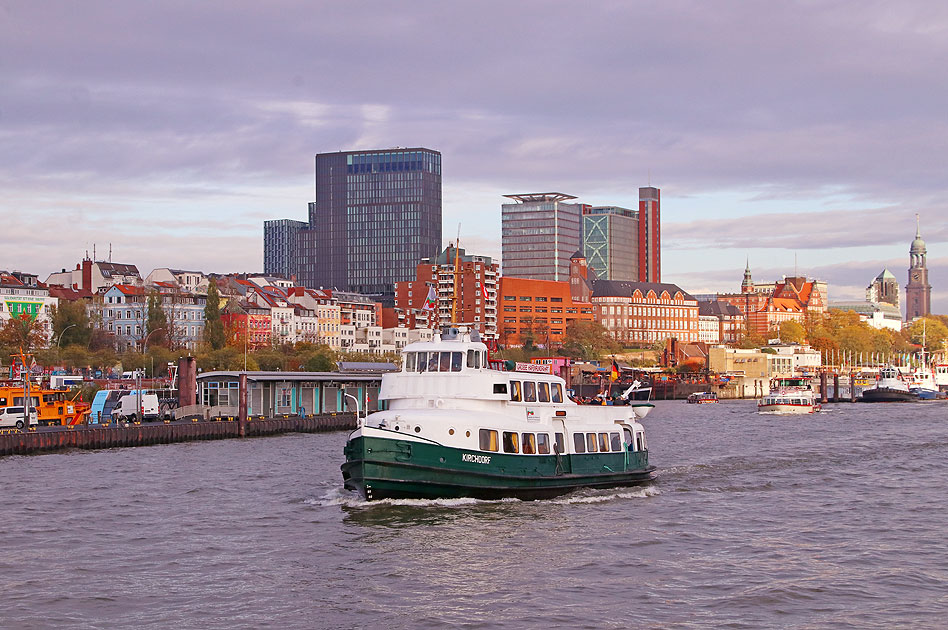 Das Hamburger HADAG-Traditionsschiff Kirchdorf am Betriebsanleger am Fischmarkt in Altona. Im Hintergrund die bekannten Hafenstraßen-Häuser. Die Kirchdorf ist heute das HADAG-Traditionsschiff und wurde 1962 auf der Sietas-Werft in Neuenfelde gebaut. Die Kirchdorf ist ein Schiff vom Typ III c. Digi Foto: IMG_1118.JPG Digi Fotos: 0379, FP10 (D15/D4/+#25) Foto: Lars Brüggemann |