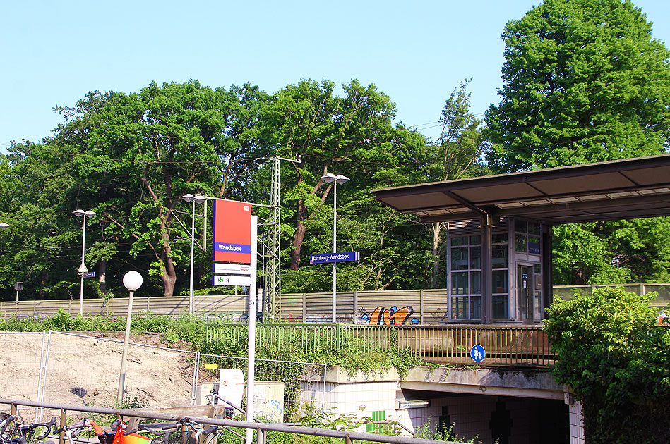 Der Eingang zum Bahnhof Hamburg-Wandsbek mit einem S-Bahn-Schild. Vor der HVV-Erweiterung waren die Vorortzüge von Hamburg nach Ahrensburg und Bad Oldesloe zwischen Hamburg und Ahrensburg nämlich als S4 geführt und man nannte diese Züge umgangssprachlich auf einfach "Ess Vier". Nach der Umstellung auf die Bezeichnung als Regionalbahn hatte man wohl vergessen das S-Bahn-Schild zu entfernen. Digi Foto: IMG_2916.JPG Digi Fotos: 0322 (D1/D7/#20) Foto: Lars Brüggemann |
