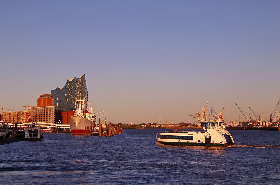Abends an den St. Pauli Landungsbrücken in Hamburg, das HADAG-Schiff Övelgönne fährt an den Landungsbrücken vorbei. Die Övelgönne ist ein Schiff vom Typ 2000 mit dem Spitznamen Bügeleisen und der Indienststellung 2006. Gebaut wurde das Schiff vom SSB Spezialschiffbau Oortkaten. Oberhalb vom HADAG-Schiff die Elbphilharmonie. Digi Foto: IMG_8601.JPG Digi Fotos: 0371, FP10 (D11/D8/#+24) Foto: Lars Brüggemann |