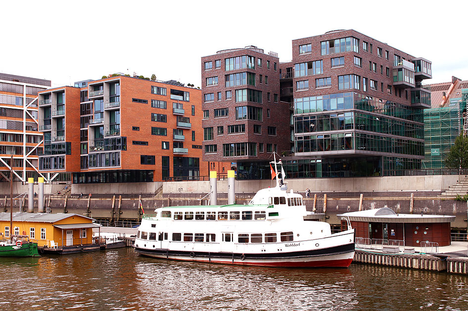 Das HADAG Schiff WOHLDORF im Sandtorhafen im Hamburger Neubaustadtteil Hafencity. Der Sandtorhafen ist auch ein Traditionsschiffhafen mit zahlreichen Museumsschiffen. Das Schiff Wohldorf vom Schiffstyp Typ III c wurde 1959 für die HADAG gebaut. Von 1989 bis 2008 war dieses Schiff im Hafen von Büsum als Restaurantschiff und trug dort den Namen: "Wappen von Büsum". Digi Foto: IMG_6293.JPG Digi Fotos: 03335, FP8 (D9/D8/#+21) Foto: Lars Brüggemann |