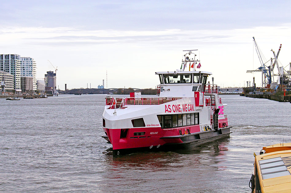 Das HADAG-Schiff Neuland fährt auf der Elbe gleich an den Anleger St. Pauli Landungsbrücken in Hamburg. Dieses Schiff ist eine Hybridfähre, das erste von insgesamt drei Schiffen, der Stapellauf war am 6. März 2024 bei der SET Schiffbau- und Entwicklungsgesellschaft Tangermünde mbH. Die HADAG ist ein öffentliches Verkehrsmittel im HVV (Hamburger Verkehrsverbund) und wickelt den Fährverkehr im Hamburger Hafen und auf der Elbe in Hamburg ab. Die HADAG wurde 1888 als Reederei mit dem Namen: "Hafendampfschiffahrts-Actien-Gesellschaft" gegründet. Digi Foto: IMG_9567.JPG Digi Fotos: 0374, FP10 (D25/D11/#+24) Foto: Lars Brüggemann |