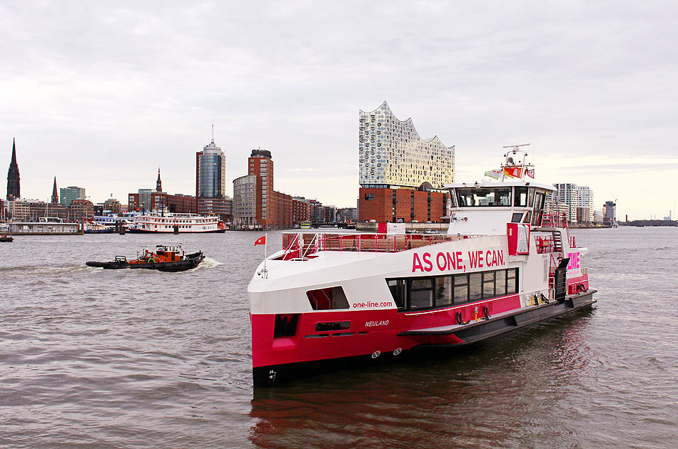 Das HADAG-Schiff Neuland fährt gleich an den Anleger Theater im Hafen. Links im Bild die bekannter Hamburger Elbphilharmonie. Dieses Schiff ist eine Hybridfähre, das erste von insgesamt drei Schiffen, der Stapellauf war am 6. März 2024 bei der SET Schiffbau- und Entwicklungsgesellschaft Tangermünde mbH. Die HADAG ist ein öffentliches Verkehrsmittel im HVV (Hamburger Verkehrsverbund) und wickelt den Fährverkehr im Hamburger Hafen und auf der Elbe in Hamburg ab. Die HADAG wurde 1888 als Reederei mit dem Namen: "Hafendampfschiffahrts-Actien-Gesellschaft" gegründet. Digi Foto: IMG_6705.JPG Digi Fotos: 0374, FP10 (D25/D11/#+24) Foto: Lars Brüggemann |