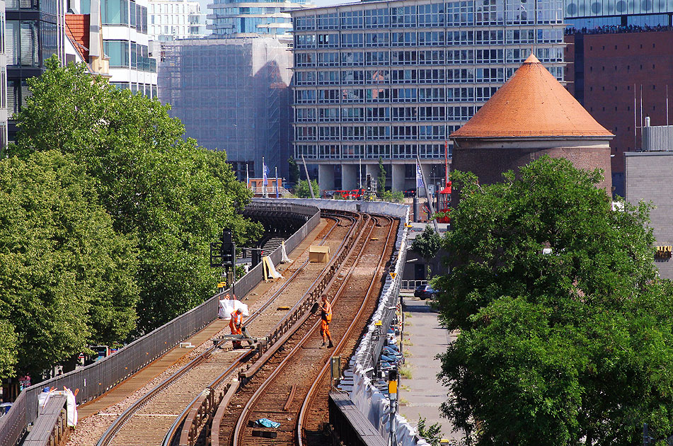 Vom 20. Juni 2025 bis zum 4. Juli 2025 fanden Bauarbeiten zwischen Landungsbrücken und Baumwall bei der Hamburger Hochbahn statt. Hier die Bauarbeiten kurz vor dem Abschluss am 2. Juli 2025. Digi Foto: IMG_8047.JPG Digi Fotos: 0382, FP10 Foto: Lars Brüggemann |