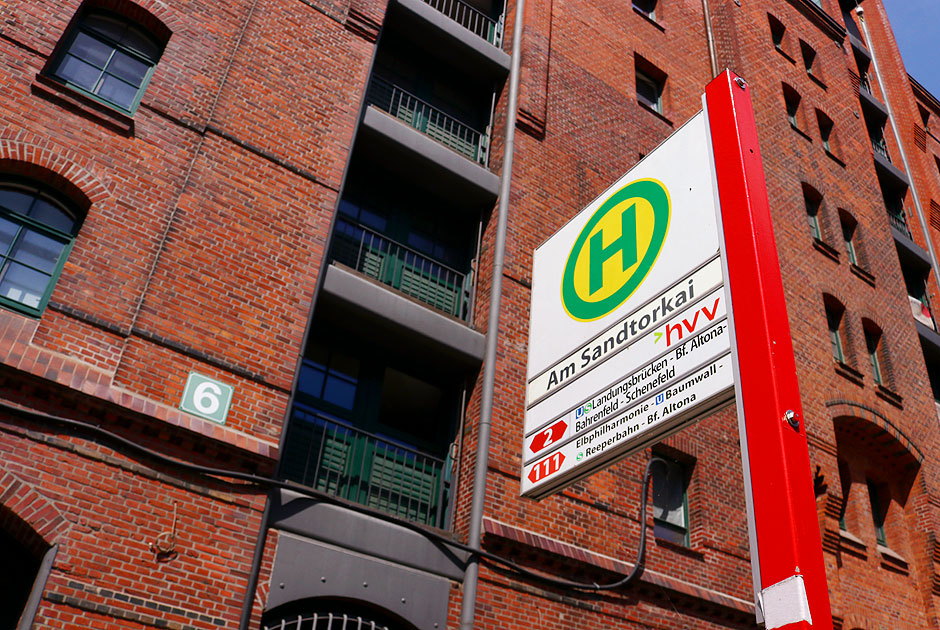 Ein Haltestellenschild der Bushaltestelle Am Sandtorkai der Linien 2 und 111 in der Hamburger Speicherstadt. Die Buslinie 111 führt zu vielen touristischen Zielen in Hamburg und gilt auch als Stadtrundfahrt zum HVV-Tarif (Hamburger Verkehrsverbund). So kommt man mit der Linie 111 zu den Landungsbrücken, dem Fischmarkt und der Reeperbahn. Von der Haltestelle Am Sandtorkai in der Speicherstadt kommt man bequem zum Miniatur Wunderland. Digi Foto: IMG_3926.JPG Digi Fotos: 0334 (D13/D7/#+21) Foto: Lars Brüggemann |