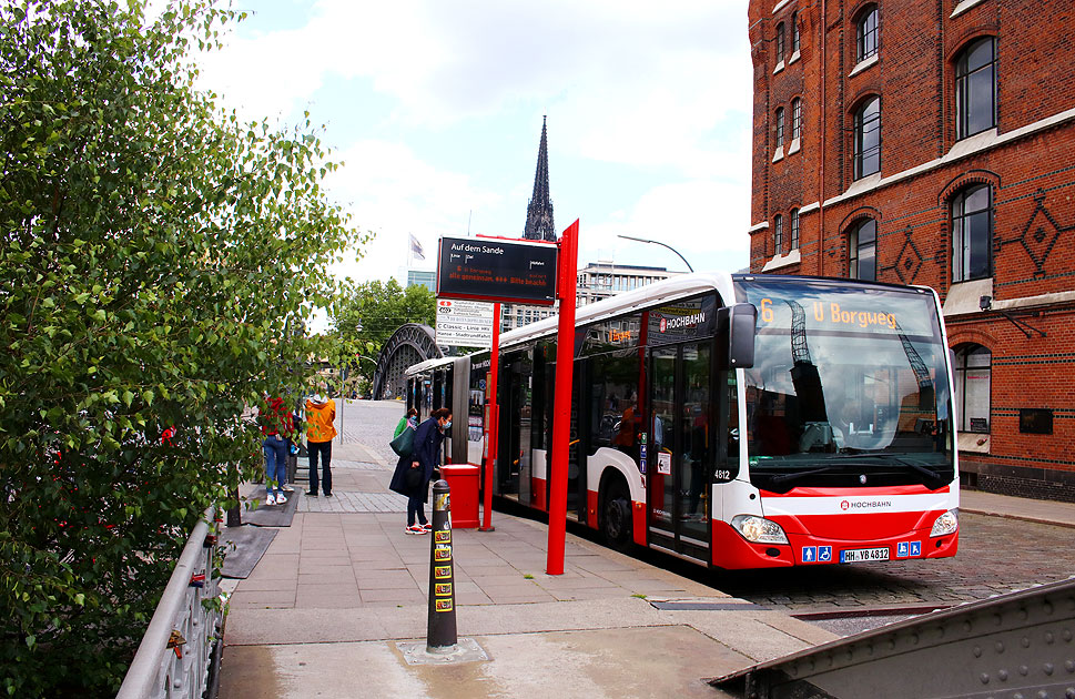 Der Hochbahn 4605 verlässt die Haltestelle Auf dem Sande als Linie 6 nach U-Bahn Borgweg. Die Haltestelle Auf dem Sande in der Hamburger Speicherstadt ist die ideale Bushaltestelle um ins Miwula (Miniatur Wunderland) zu kommen. Von hier aus läuft man ein bis zwei Minuten bis zum Miwula. Digi Foto: IMG_0285.JPG Digi Fotos: 0369,FP10 (D20/D6/#+24) Foto: Lars Brüggemann |