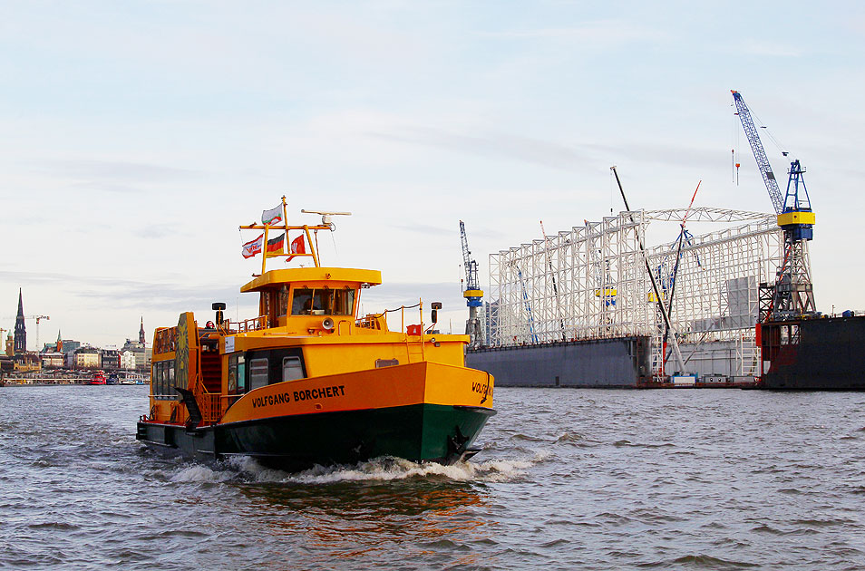 Einen Tag vor dem Hafengeburtstag in Hamburg: Die HADAG-Fähre Wolfgang Borchert gibt einen kleinen Vorgeschmack auf das Schlepperballett und schaukelt zwischen Backbord und Steuerbord hin und her. Die Wolfgang Borchert wartet hier vor dem Anleger an den St. Pauli Landungsbrücken auf einen freien Platz um anlegen zu können. Oberhalb von der Wolfgang Borchert die Elbphilharmonie. Digi Foto: IMG_2309.JPG Digi Fotos: 0380, FP10 (D8/D5/#+25) Foto: Lars Brüggemann |