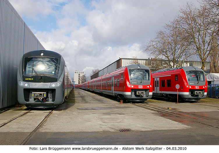 Auf dem oberen Foto stehen drei Triebwagen der Baureihe 440 am 4. März 2010 im Alstom Werk in Salzgitter, links ein Triebwagen für die Hochbahn/Benex-Tochter Agilis. Digitalfoto: IMGP9559.JPG Digi Fotos: 0198 Foto: Lars Brüggemann |