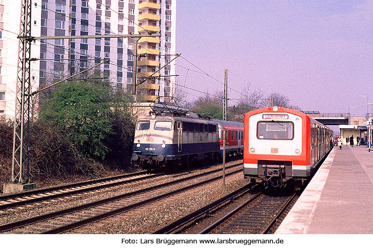 Die 110 107 kommt mit einem Eilzug aus Richtung Schwerin in den Bahnhof Hamburg-Bergedorf am 11. Oktober 2001 eingefahren. Hinter der Lok Doppelstockwagen der ehemaligen DDR-Reichsbahn. Hinten links im Kehrgleis der S-Bahn ist der 471 062 zu erkennen. Die 110 107-0 wurde 1957 von Krauss-Maffei mit der Fabriknummer 18231 an die Deutsche Bundesbahn geliefert. 1971 hatte die E-Lok einen Brandschaden erlitten und wurde danach komplett neu aufgebaut. So erklärt sich auch der aerodynamisch günstigere Lokomitivkasten, also die die Bügelfalten-Form der niedrigen Loknummer einer Einheits-Kastenform-Lok. Im Jahr 2003 wurde die Lok verschrottet. Dia U 24.211 FP2 Foto: Lars Brüggemann Interner Vermerk: Dieses Foto ist noch unter einem anderen Dateinamen online. Diese Seite ist ein Teil einer Online-Foto-Sammlung ähnlich einem Bildband, Sie können sich hier von Baureihe zu Baureihe durchklicken. Vielleicht suchen Sie aber Fotos für eine Heimatchronik, ein Fachbuch oder einen Fachartikel? Schreiben Sie mir! Email an Lars Brüggemann: mail@larsbrueggemann.de zurück zur: Startseite |