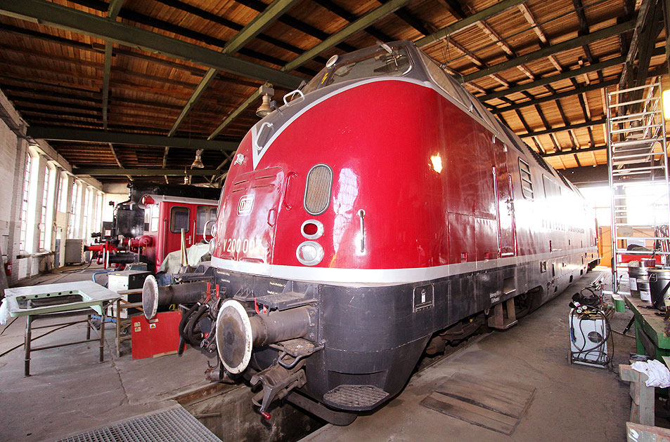 Im Eisenbahnmuseum Kulturlokschuppen Neumünster steht hier die V 200 007. Diese Lok wurde 1956 von MaK mit der Fabriknummer 2000007 an die Deutsche Bundesbahn geliefert. Nach ihrer Ausmusterung im Jahr 1984 bei der Deutschen Bundesbahn als 220 007-9 wurde diese Lok zur Museumslok. Digi Foto: IMG_9194.JPG Digi Fotos: 0368, FP10 (D18/D5/#+24) Foto: Lars Brüggemann |