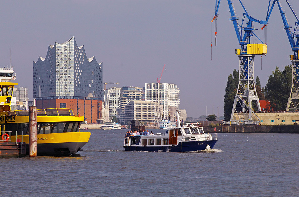Das Schiff MS Naku fährt auf der Elbe am Fischmarkt in Altona vorbei. Links am Bildrand das HADAG-Schiff Tollerort. Oben links die Elbphilharmonie, in der Mitte die Hafencity und hinten in der Mitte zwei Abicht-Schiff. Rechts im Bild zwei Hafenkräne. Digi Foto: IMG_4635.JPG Digi Fotos: 0372, FP10 (D3/D9/#+24) Foto: Lars Brüggemann |