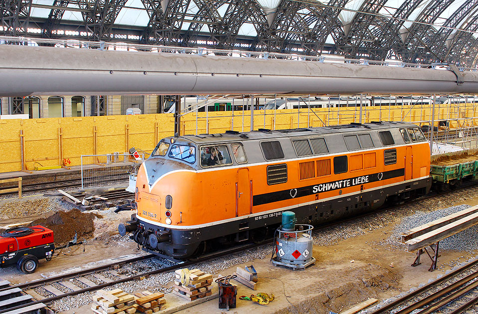 Die 221 135-7 der Bocholter Eisenbahngellschaft ist hier bei Bauarbeiten in Dresden Hbf im Einsatz. Die Lok wurde als V200 135 im Jahr 1965 von der Deutschen Bundesbahn in Betrieb genommen und von Krauss Maffei mit der Fabriknummer 19255 geliefert. Digi Foto: IMG_0297.JPG Digi Fotos: 0304 (D22/D1/dana19) Foto: Lars Brüggemann |